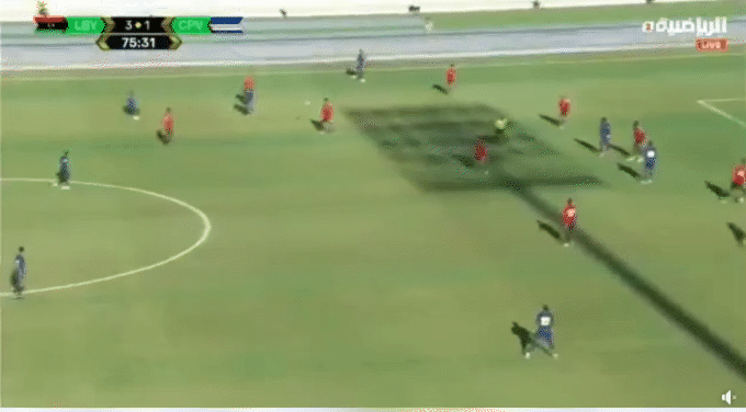 在上半场临近结束前,佛得角通过泰尔莫·阿尔坎哈接埃比托·塔瓦雷斯传中的头球,扳平了比分。紧接着,利比亚在半场前又由埃兹丁·埃尔·马雷米再次取得领先,显示出他们在前场的攻势组织和个人能力仍然很强。比赛进入下半场的高潮阶段,马哈茂德·阿尔·沙卢伊在距离球门30码左右突然起脚的一记任意球,越过门将沃齐尼亚的注意范围,打出了一记极具观赏性的远射,帮助利比亚将比分改写为2-2,似乎就要把胜利留在自己手中。