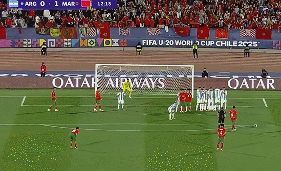 第12分钟,扎比里主罚任意球直接攻门,皮球越过人墙之后飞向球门左上角,阿根廷门将扑救不及,摩洛哥1-0先下一城。