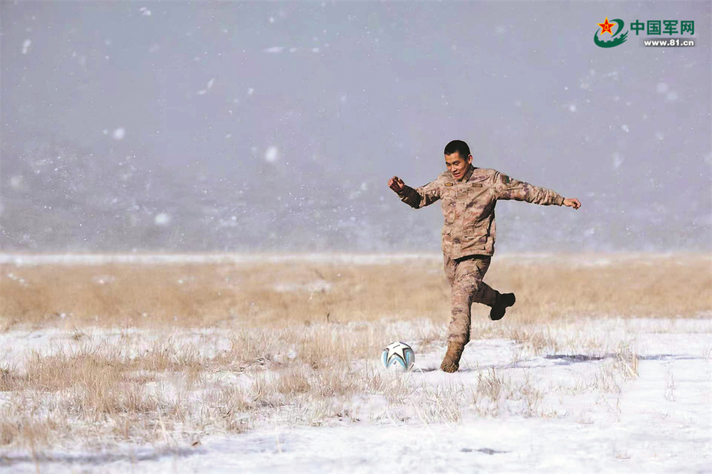 新疆军区科加尔特边防连战士参加雪地足球赛。(报特约记者 王军强 摄)